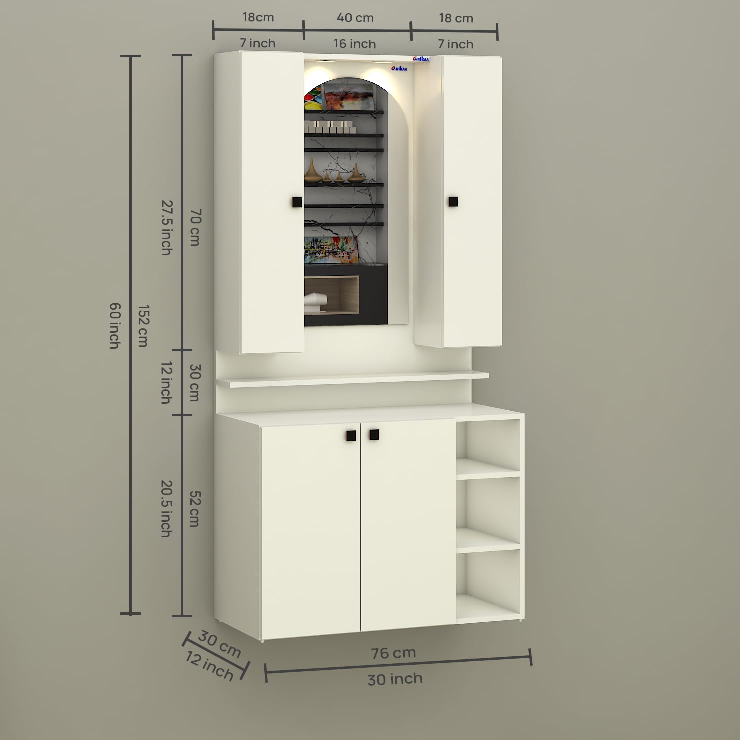 - Ample Storage with Multiple Sections – Includes 2 side cabinets (18cm / 7-inch width each), center mirror cabinet (40cm / 16-inch width), and bottom storage cabinet (76cm / 30-inch width) with shelves for cosmetics, accessories, and essentials.